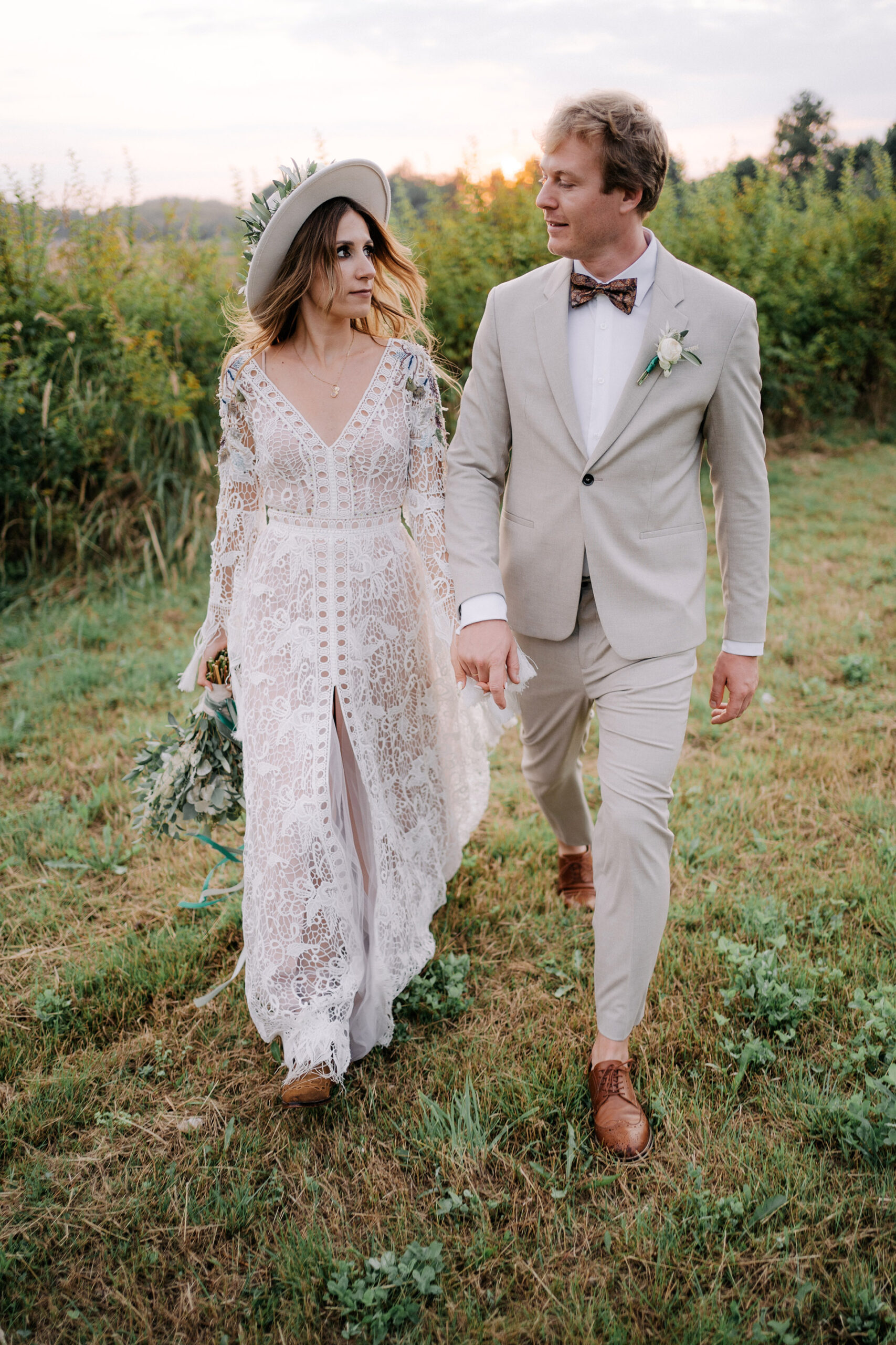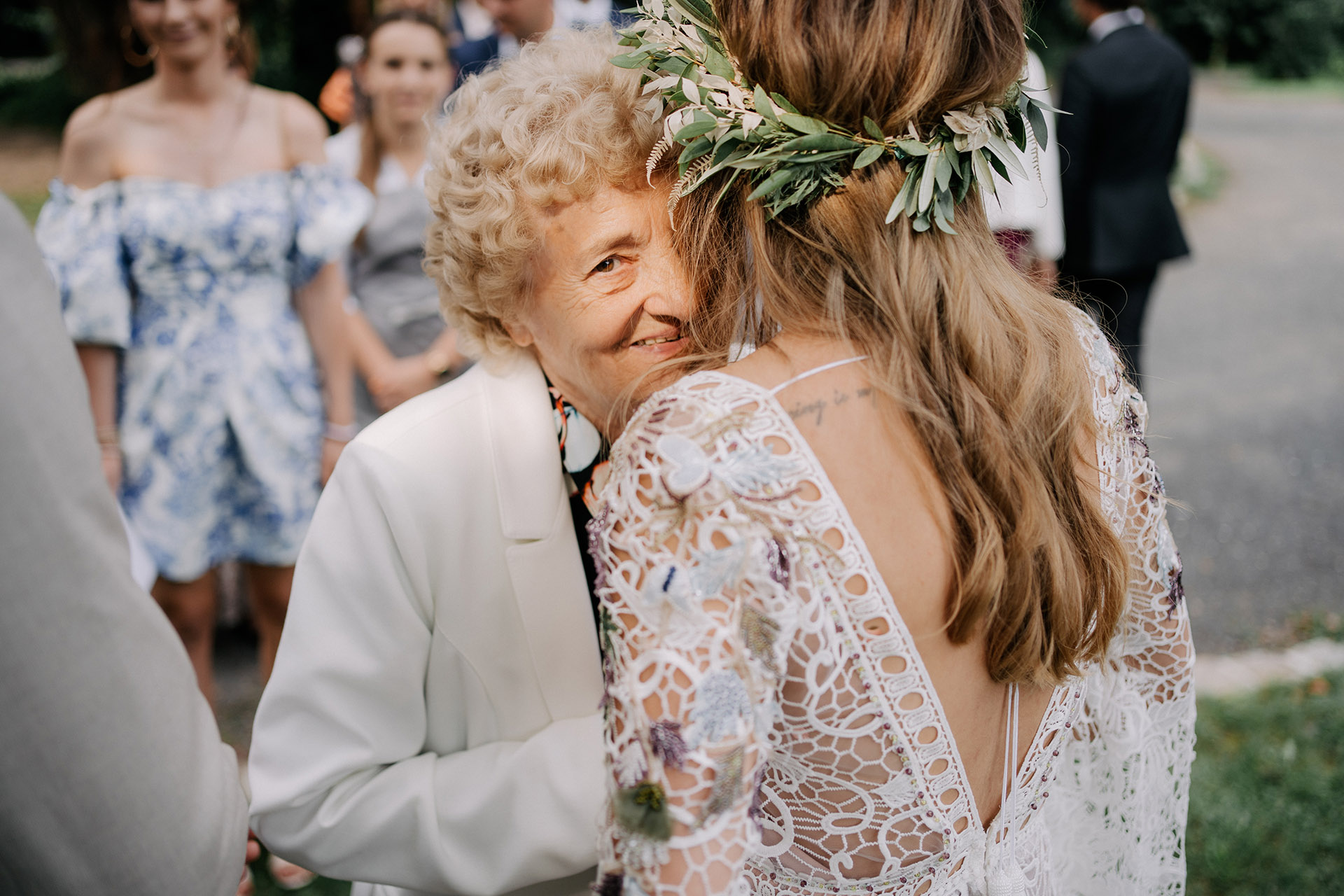 Zabrałem Benię i Jakuba na kilkanaście minut. Dosłownie „za salę”. Mieliśmy ten krótki czas przed zachodem słońca by uchwycić ich piękne uczucie. Nie były to tylko pozowane zdjęcia. W sumie były głównie zupełnie inne – w ruchu. Takie lubię najbardziej. Benia i Jakub czuli się jak „ryby w wodzie” i grali w moją grę. Bieganie, przytulanie, pocałunki. Uśmiech i radość – to staram się złapać na szybkich sesjach w dniu ślubu.